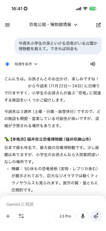 『今週末、小学生の孫と行ける、この近くの恐竜がいる公園か博物館を教えて。できれば入場料も』っと…