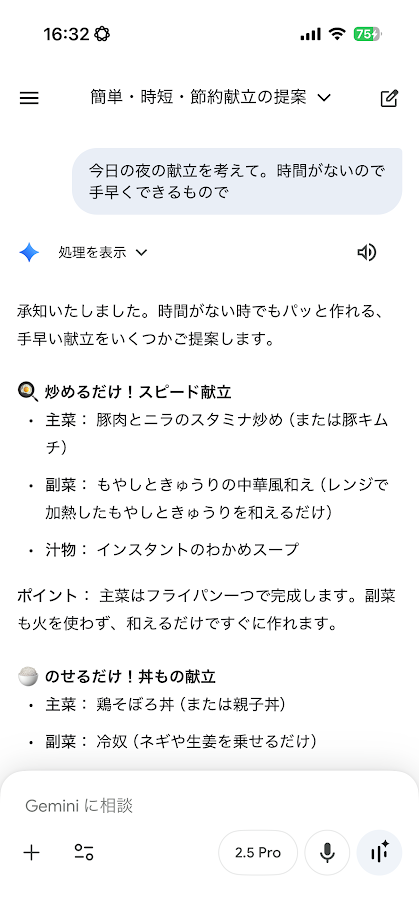 そうなんです。『レシピ検索』も『プレゼントのアイデア探し』も『メールの文章作成』も、全部Geminiに『〜して』ってお願いするだけでOK。もう、いくつもサイトを見て回る必要がないんです