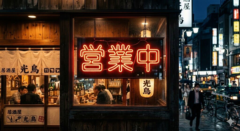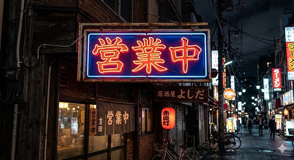 プロンプト例①:ネオンサインで「営業中」と書かれた看板