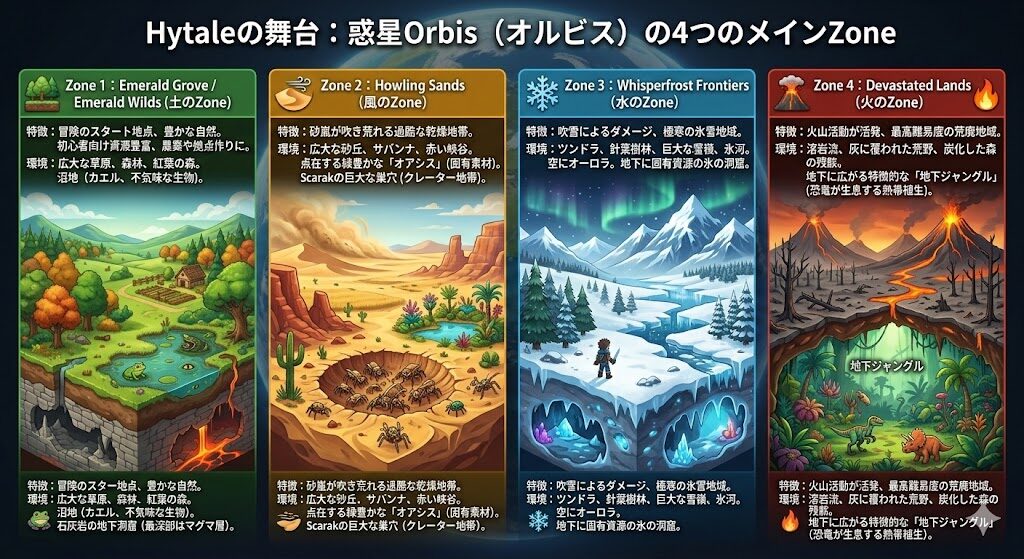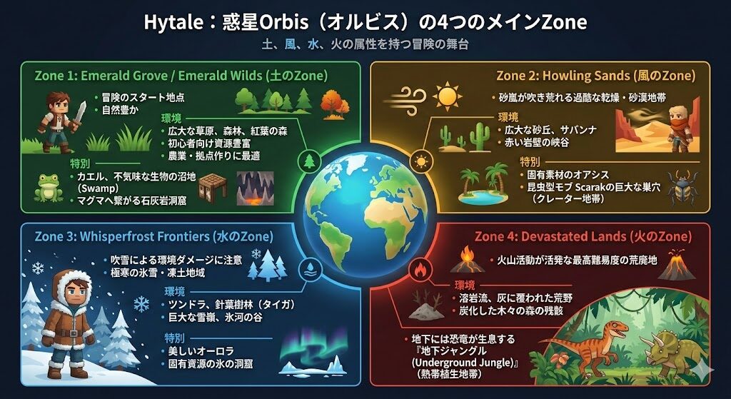 Hytaleの舞台となる惑星Orbis(オルビス)4つのメインZoneで構成されています。