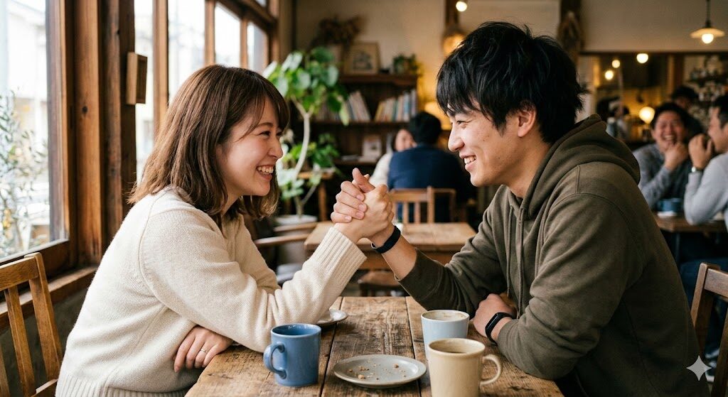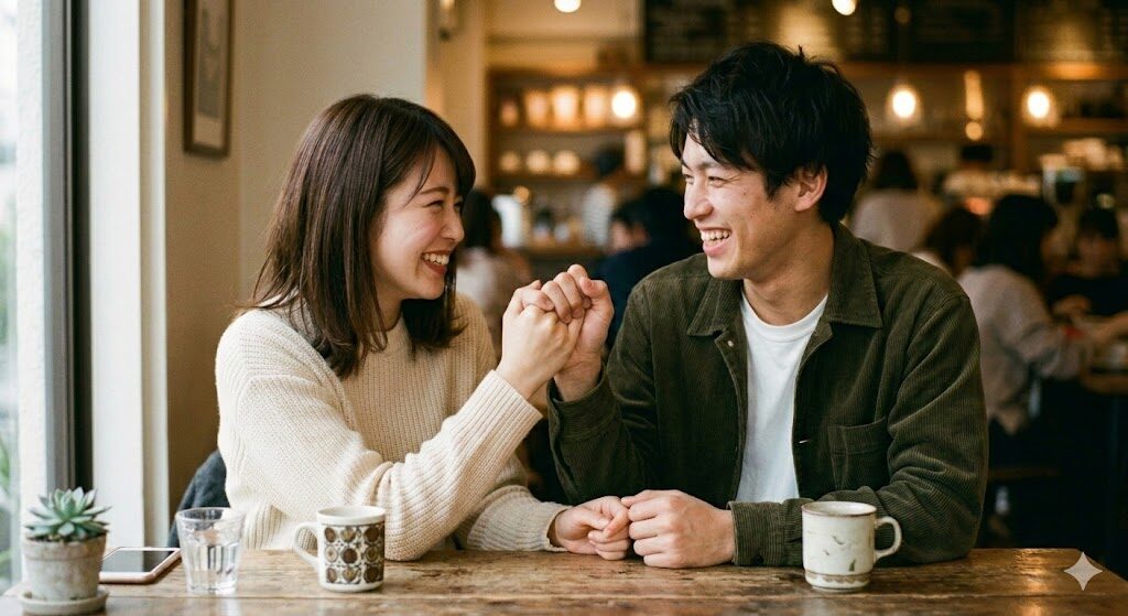 「若い恋人が指相撲をしながら微笑みあっている写実的な画像を描いて」