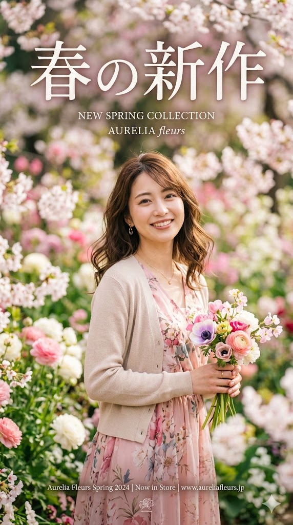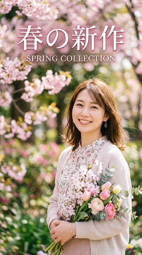 検証プロンプト例:「春の新作」というキャッチコピーが入った、被写界深度の浅いポートレート風のポスター