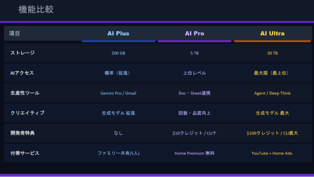 ChatGPT PlusやClaude Proが純粋に「強力なAIモデルへのアクセス権」を販売しているのに対し、Google AI ProはAI機能と大容量ストレージ、スマートホーム、フィットネスを組み合わせた「バンドル型」の価値構造をとっています。