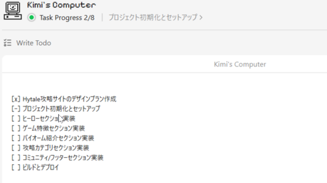 「Kimi k2.5」さんはToDoリストを作ってそれに沿って作業を進めていく方針のようですね。1個づつ順番にクリアしていくようです。