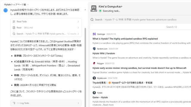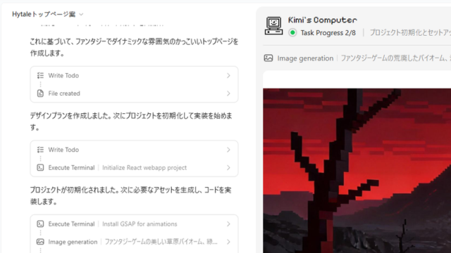 では実際に製作を指示してからどんなふうに「Kimi k2.5」が作業していたのか見ていきましょう。