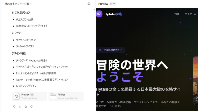 まずは結果を見て下さい。下記がいい加減な1行プロンプトで作られたHytale攻略サイトのトップページです。↓